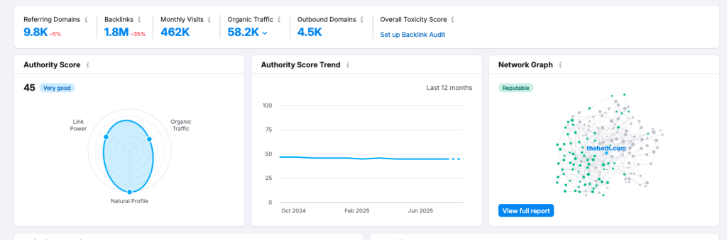 Semrush’s Backlink Analytics tool serves as a central hub for everything related to your link-building campaign, including your authority score, total backlinks, organic traffic, and more.