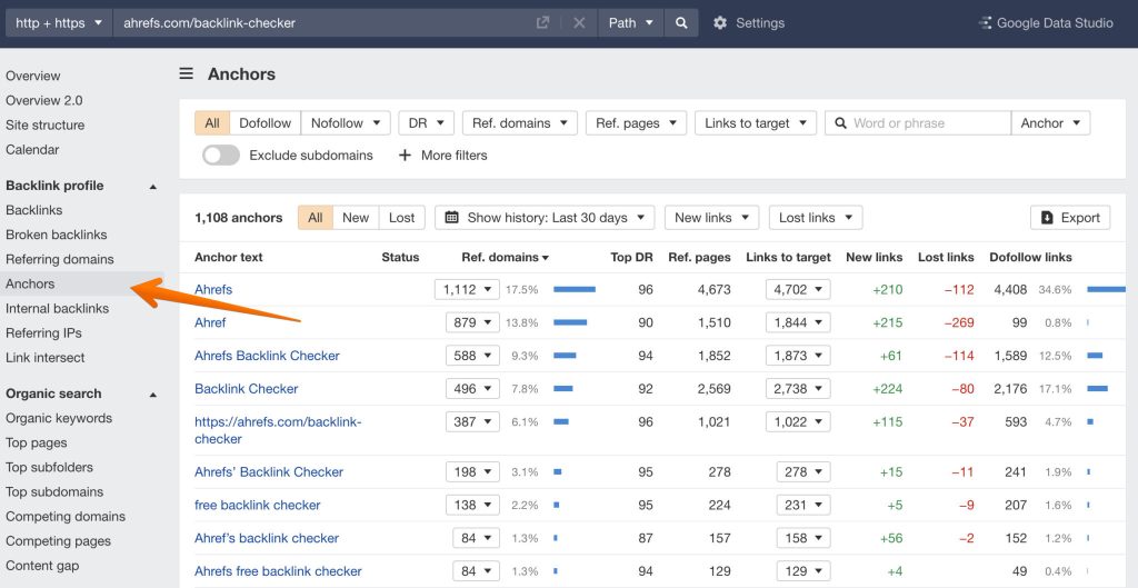 This is where it’s helpful to have a paid subscription to a tool like Ahrefs or Semrush. They have detailed reports that list all your anchors in one spot, which makes auditing them especially easy: