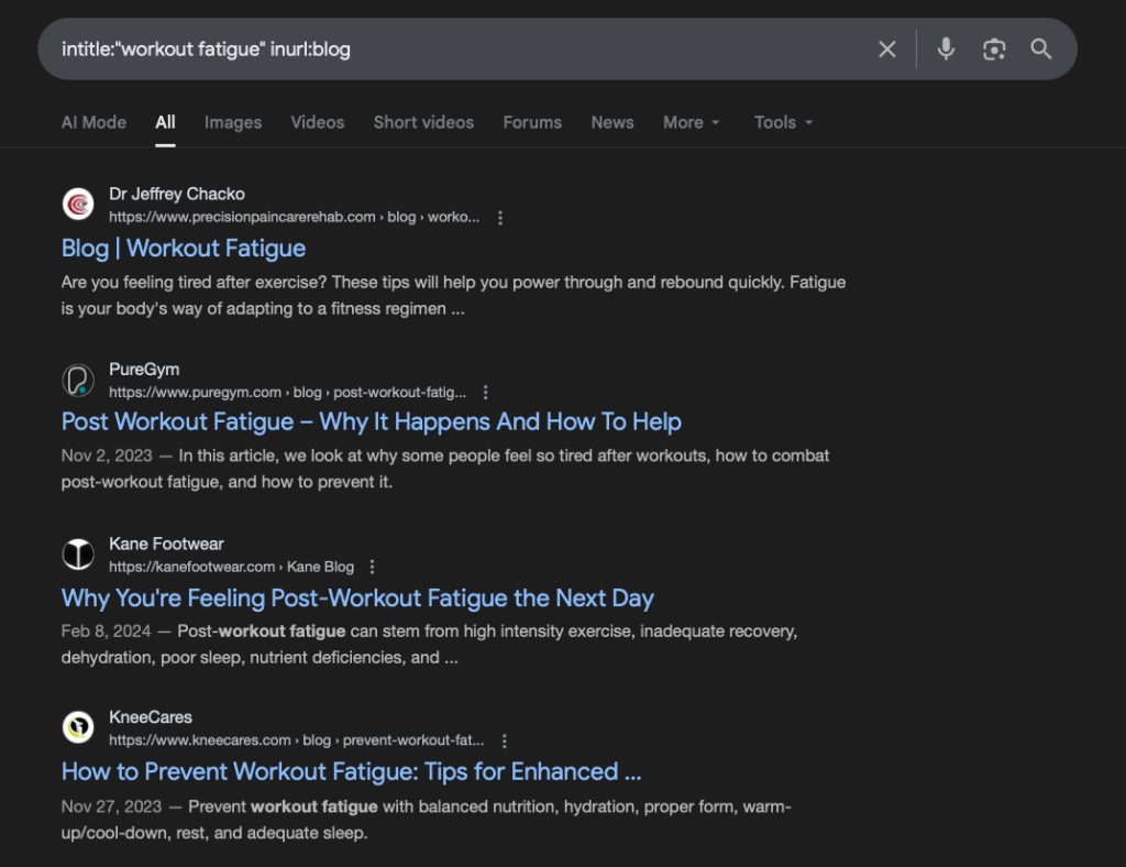 You can use search operators on Google to narrow your search. Let’s use intitle:“workout fatigue” inurl:blog to quickly find some blogs that mention ways to deal with exercise fatigue:
